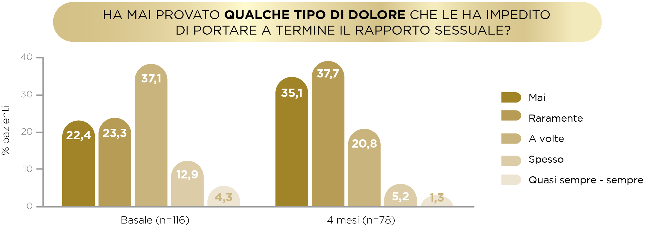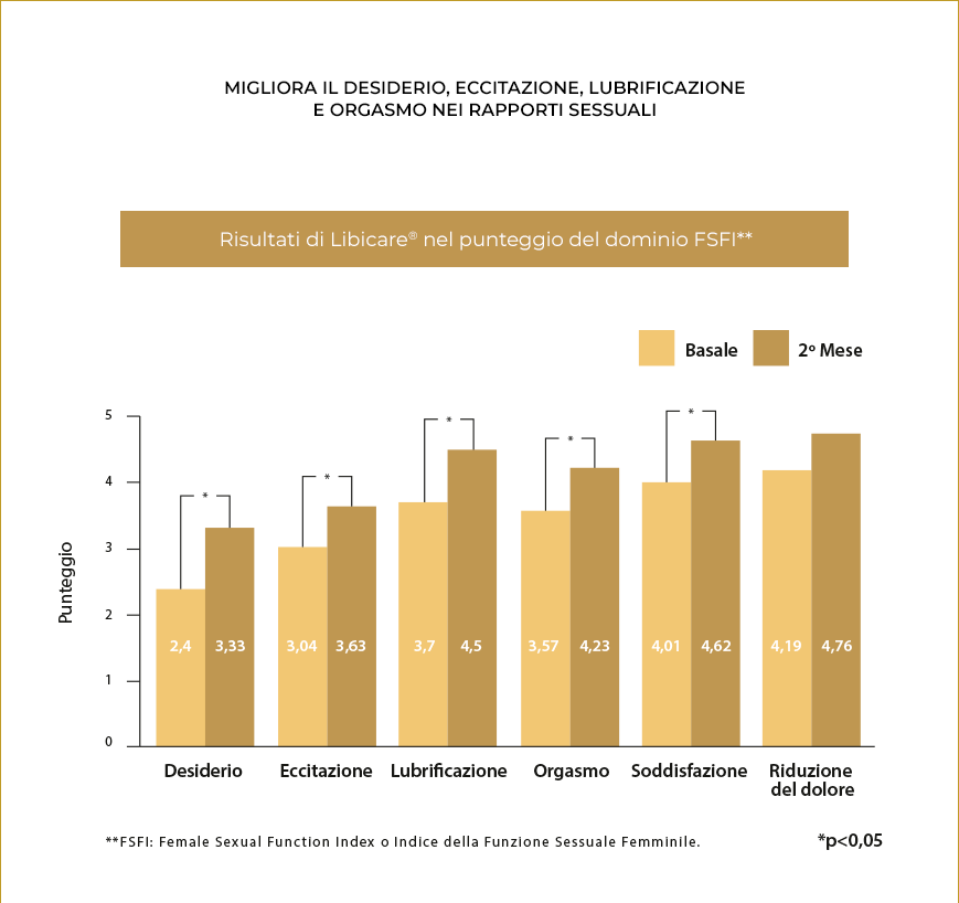 Inoltre, secondo i risultati dello studio LIBIDOBS, l’uso di Libicare® ha ridotto la dispareunia nelle pazienti, passando dal 45% che non aveva mai/quasi mai provato dolore, al 73% alla fine dello studio: